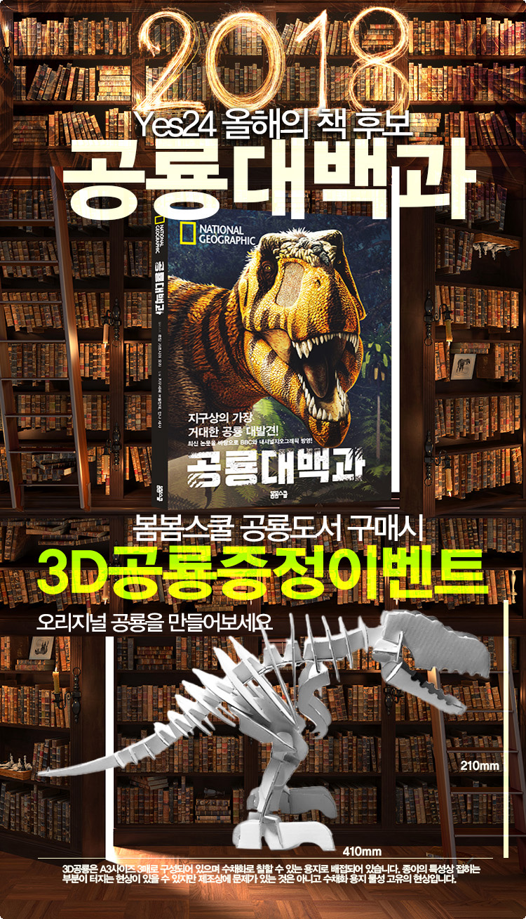 공룡대백과 수채화가 가능한 3D공룡 증정이벤트 Yes24에 2018년 올해의 책 후보로 내셔널지오그래픽 공룡대백과가 선정되었습니다. 기념으로 원래 따로 책을 준비하던 페이퍼그래프트 다이노소어를...