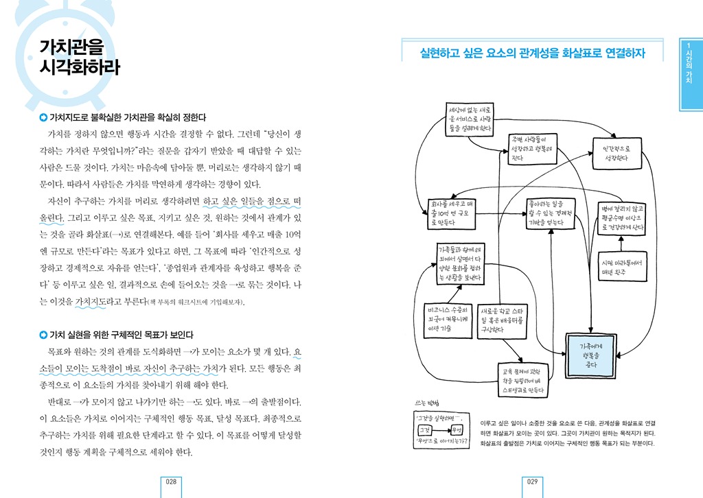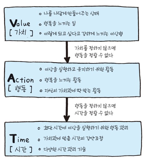 저자는 시간관리 기술의 기본으로 가치(Value)를 손꼽는다. 가치에 따라 행동을 결정짓고, 시간을 분배하기 때문이다. 이를 통해 버릴 것과 취할 것을 선별할 수 있다면 그것만으로 시간은 충분히 절약될 수 있다.