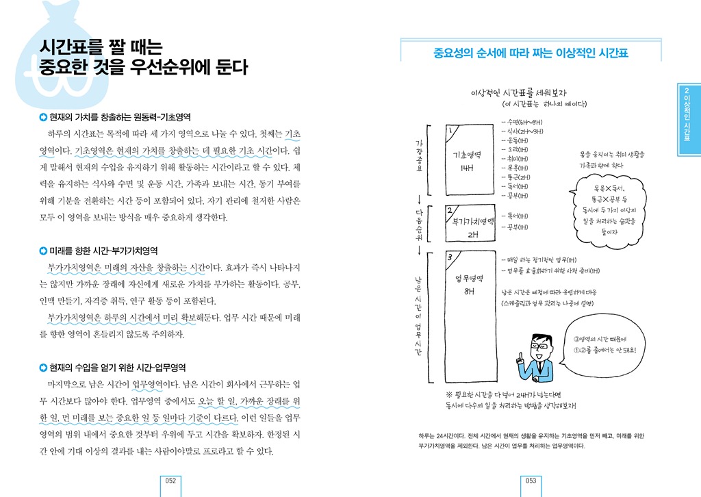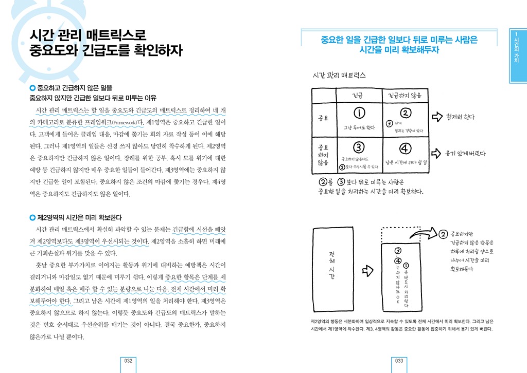 시간은 평등하다! 각기 처한 환경과 상황은 다르지만 시간만큼은 누구에게나 똑같이 흐른다. 그런데 같은 일을 하면서 항상 시간이 부족해 야근을 밥 먹듯이 하는 사람이 있는 반면에 여유롭게 업무를 끝내고 남은 시간에 자기계발과 취미를 즐기는 사람도 있다.