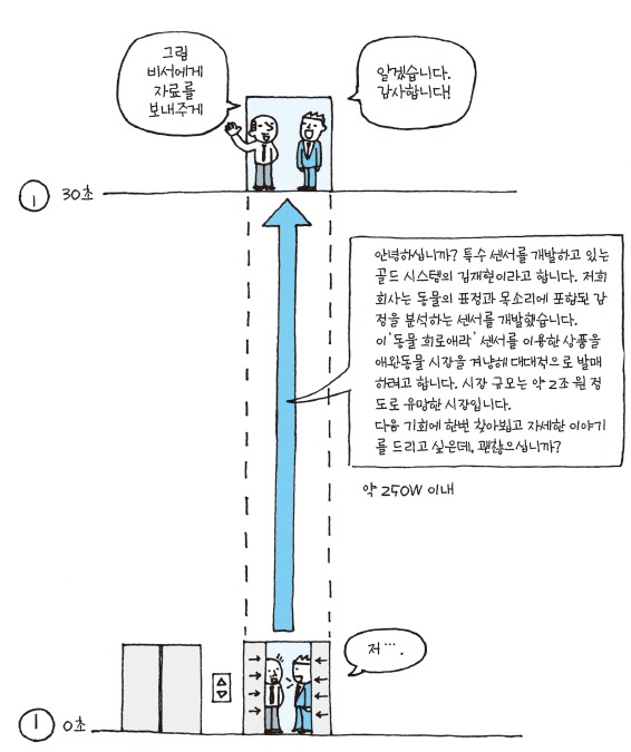 만일 당신이 기업가라면 투자자와 함께 엘리베이터에 탔을 때, 내리기 전까지 30초 동안 비즈니스 계획을 간결하게 설명할 수 있는가? 이때 자신의 사업계획을 핵심만 집어 설명할 수 있다면 당신은 투자자에게 강한 인상을 줄 수 있을 것이다.