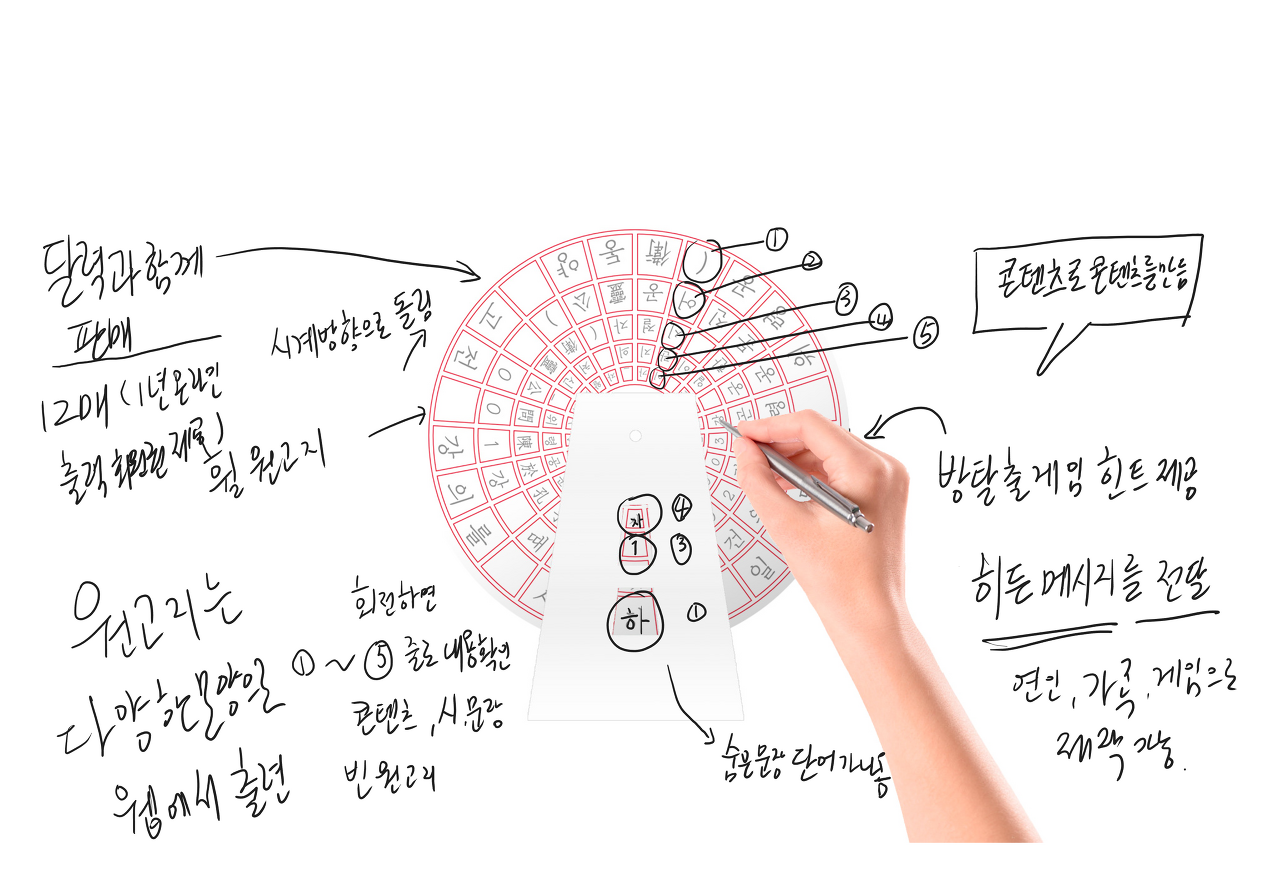 방탈출게임을 만들 생각으로 구성했던 히든메시지 패널 글자가 구멍이 뚫린 원판에 메시지를 돌려가며 맞추면 새로운 글자가 나오는 아이디어를 간략하게 이미 칼선을 만들어 놓은 휠캘린더에 3개의 구멍에 맞춰 휠 원고지에 아이디어를 적용