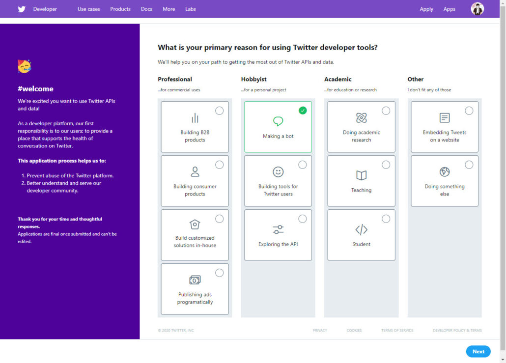 에서 개발자 등록을 합니다.3. https://developer.twitter.com/en/application/use-case