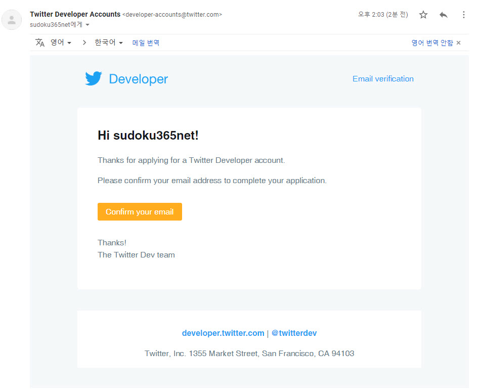 8. 어플리케이션 컨펌 대기를 하고 트위터에서 향후 메일로 알려줍니다.