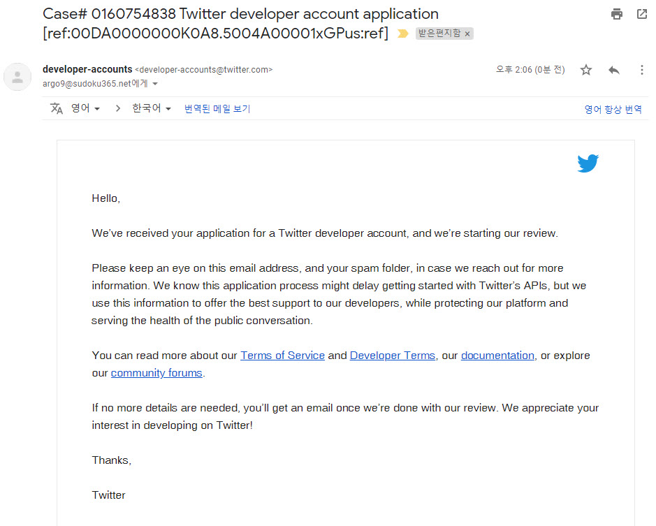 9. 트위터 개발자 등록에 부족한 사항이 생기면 메일로 수정하면 됩니다.