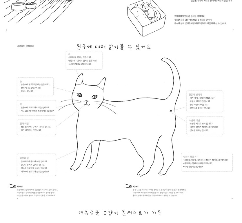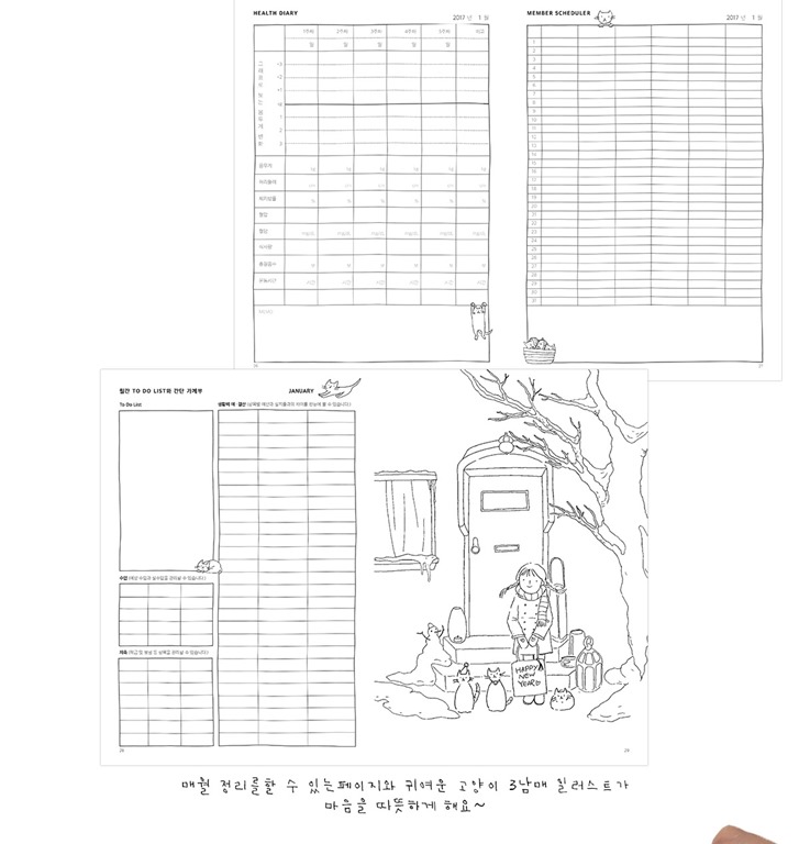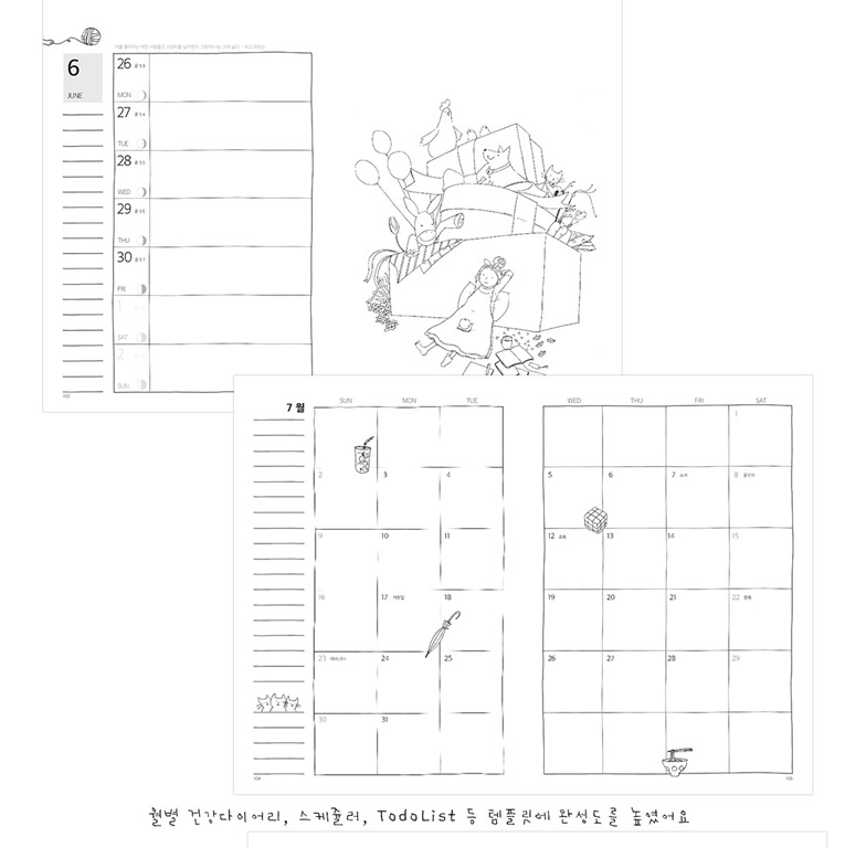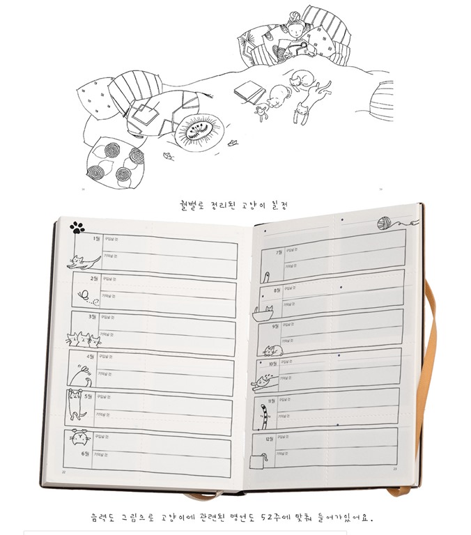 고양이와 함께 살아가는 데 이미 익숙해진 집사들이라면 충분히 공감할 만한 일러스트들 또한 월간 및 주간 일정이 이어지는 곳곳에 실었습니다.