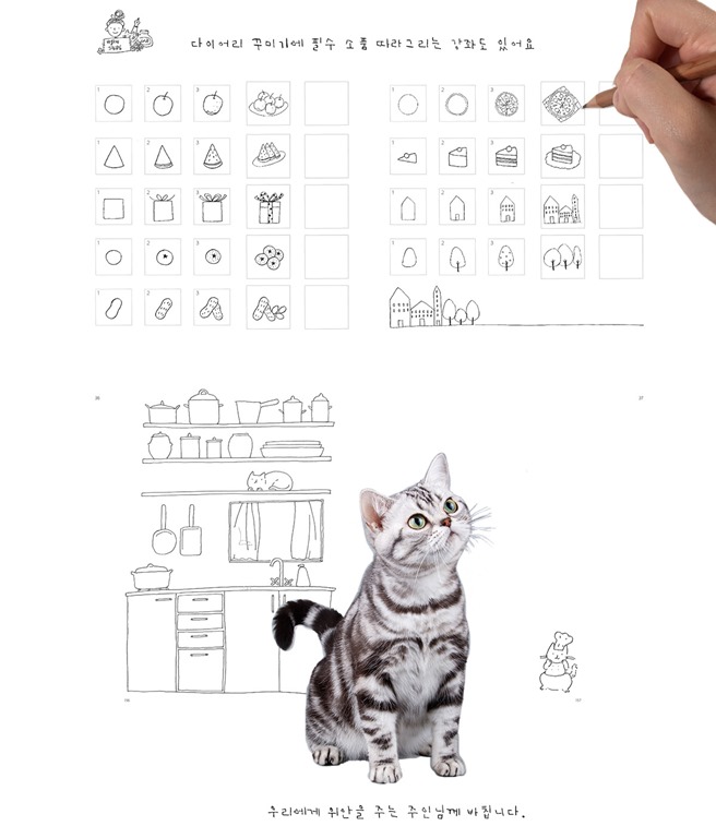 여러 분야의 유명한(그러나 우리와 마찬가지로 집사일 뿐인!) 사람들처럼 자신만의 고양이가 가르쳐준 사랑이 있다면 노트들과 고양이 말풍선을 채워보세요. 한편, 선 그리기 기본부터 해서 일러스트 기법을 따라 그리다보면 <2017 CAT DIARY BOOK 고양이 집사 다이어리>가 당신과 당신 고양이의 이야기로 어느새 가득 찰 겁니다.