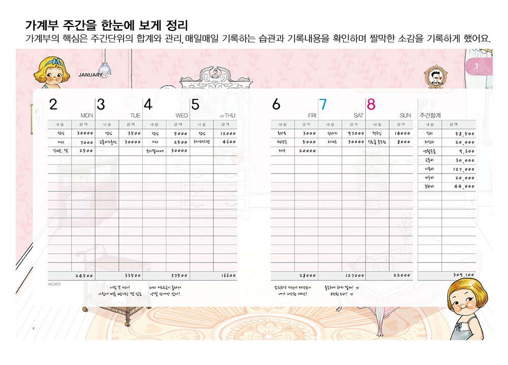 소비 패턴을 파악하고 돈이 어디로 빠져나가는지를 점검하는 것은 물론 주부에게는 꼭 필요한 핵심 정보도 빠짐없이 담았어요. 가벼운 마음으로 알뜰지수를 점검할 수 있으며 현명한 가계부 작성 요령도 배울 수 있어요.