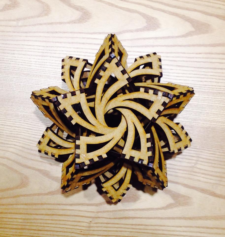 Frabjous라는 이름의 퍼즐인데요, 레이저 컷팅기로 MDF를 잘라 가조립 한 상태에요~ 12면체를 기반으로 안쪽으로 꼭지점 끼리 이어진 형태입니다!! 빛이 통과할 수 있는 아크릴로 만들면 아주 아름다운 조명이 될 것 같아요~ 아크릴 버전도 기대해 주세요 😀 !! Posted by EverPress for Node