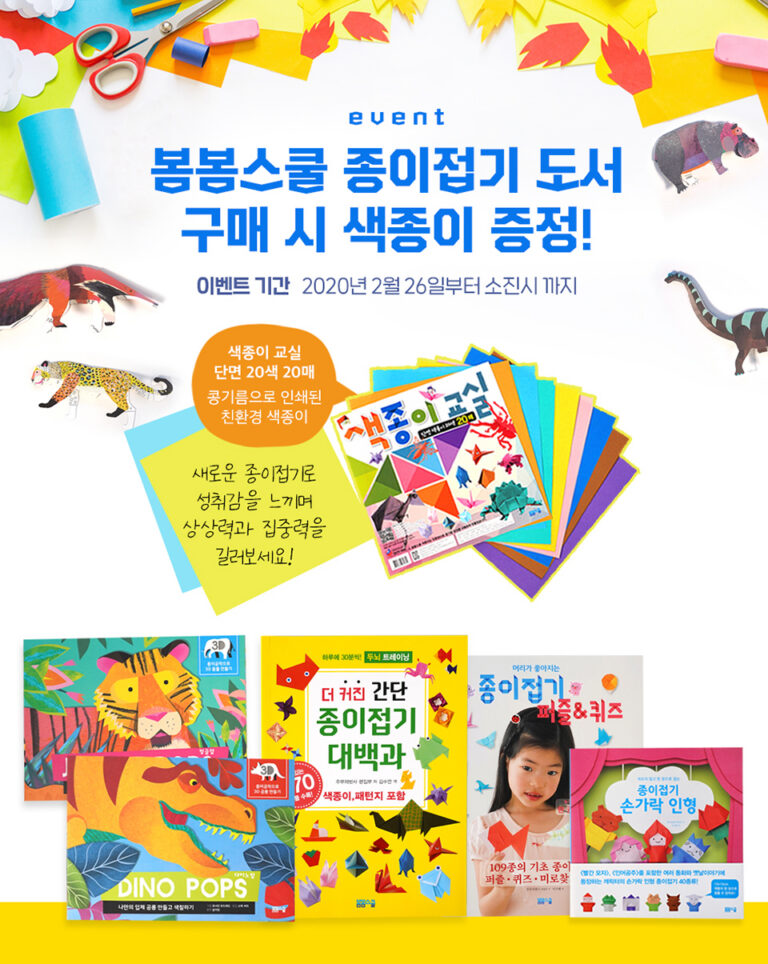 이벤트 도서 구매 시 단면20색 색종이(20매) 증정(포인트 차감) 이벤트가 3월말까지 진행됩니다. 이벤트 기간 2020/02/26 ~ 2020/03/31 이벤트 도서 구매 시 단면20색 색종이(20매) 증정(포인트 차감)...