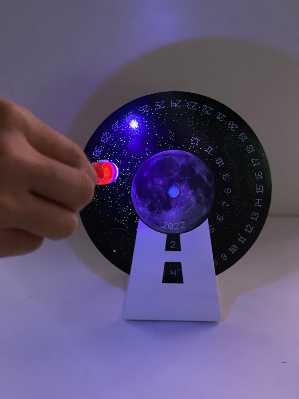 우주의 시간처럼 일, 월 두개의 회전하는 휠을 사용하는 만년력에는 특별한 비밀이 있습니다. 모든 별을 형광물질로 제작하여 함께 동봉한 비밀 펜(블랙 라이트 UV-A)을 비추면 어둠 속에서 별자리가 선명하게 나타납니다.(별도구매)