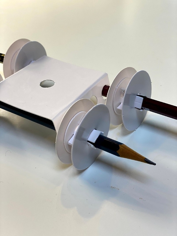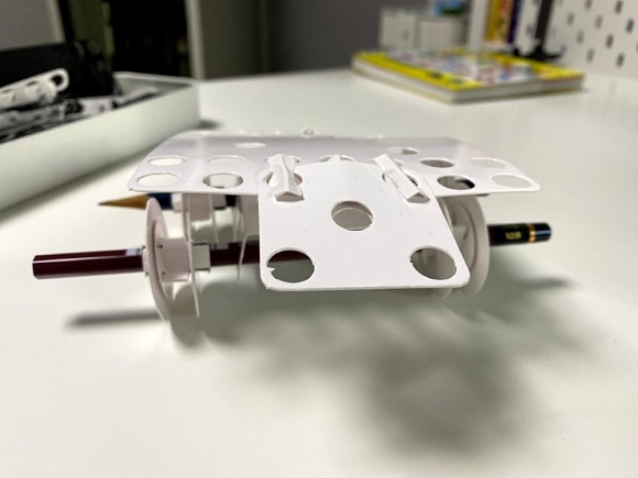 연필을 사용하여 바퀴 축을 만들고 + 모양과 바퀴모양을 결합하여 실제 구동이 되는 바퀴를 만들었습니다.