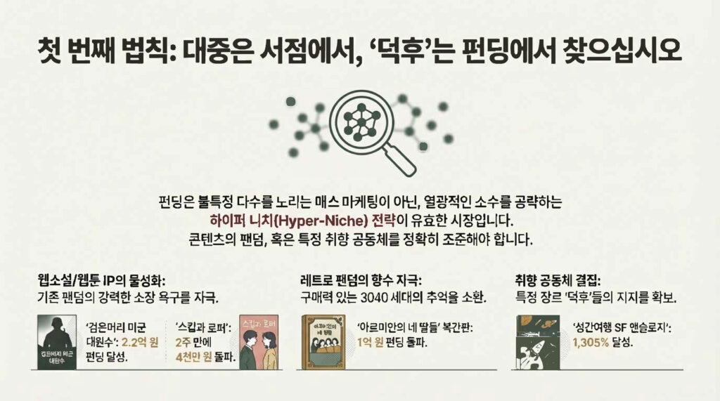 일반 도서는 불특정 다수(Mass)를 타겟으로 기획되지만, 텀블벅은 고도로 세분화된 취향 공동체(Niche Community)들의 집합이다.