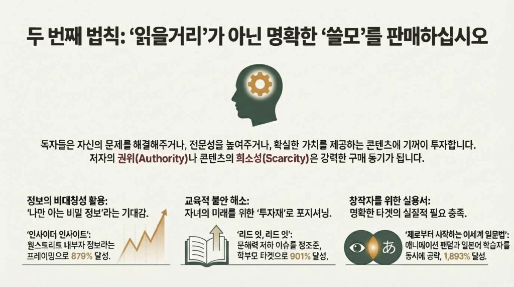마이크로 타겟팅: "20대 여성을 위한 에세이"가 아니라, "퇴사 후 번아웃이 온 INFJ를 위한 회복 일지"와 같이 타겟을 좁고 구체적으로 설정해야 한다. 12는 타겟 고객 설정이 명확할수록 가격 탄력성이 낮아져 매출 극대화가 가능함을 시사한다.