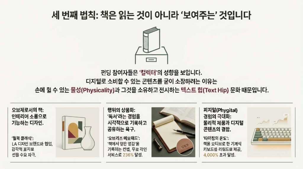 주객전도 현상: 13의 사례처럼 소책자나 특별 굿즈는 본품인 책보다 더 높은 가치를 지니기도 하며, 굿즈를 얻기 위해 책을 후원하는 양상이 뚜렷하다. 일반 도서가 펀딩에 성공하려면 금박 제본, 한정판 케이스, 작가 친필 사인, 혹은 책 속 세계관을 구현한 뱃지나 키링 등 '물리적 소장 가치'를 극대화해야 한다.