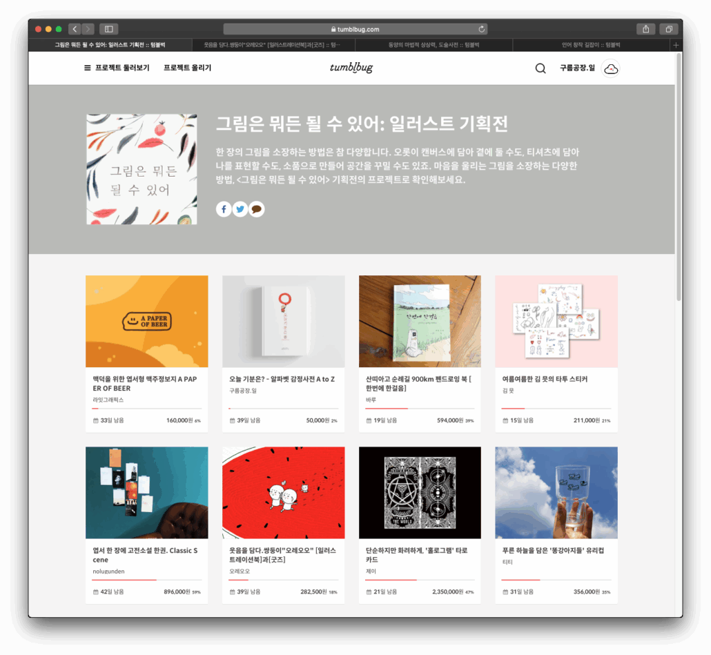 텀블벅에서 그림은 뭐든 될 수 있어: 일러스트 기획전을 지난달에 신청하였습니다. 17일 오픈이었는데 저희가 다른 일을 마무리하고 디자인을 수정하느라 조금 늦게 오픈했습니다.