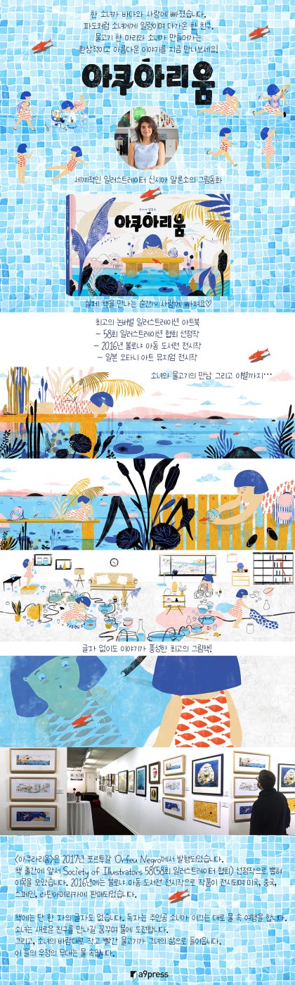 <아쿠라리움>은 2017년 포르투갈 'Orfeu Negro'에서 발행되었습니다. 책 출간에 앞서 'Society of Illustrators 58'(58회 일러스트레이터 협회) 선정작으로 뽑혀 이목을 모았습니다. 2016년에는 '볼로냐 아동 도서전' 전시작으로 작품이 전시되며 미국, 중국, 스페인, 라틴아메리카에 판매되었습니다.