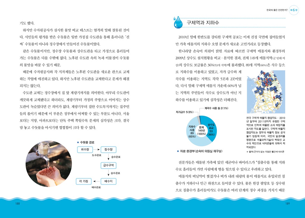 꼭 방사성 문제를 언급하지 않더라도 소독을 위해 첨가하는 각종 화학약품은 새로운 유해 물질을 만들어 내고 물의 생명을 죽이기 때문에 수돗물은 매력이 없다. 여기에 노후된 수도관 문제도 겹친다. 노후된 수도관을 교체한다고 문제가 해결되지는 않는다. 수도관 교체는 정수장에서 집 앞 계량기까지를 의미한다. 아무리 수도관이 깨끗하게 교체됐다고 하더라도, 계량기부터 가정의 주방으로 이어지는 상수도관이 녹슬었다면 큰 의미가 없다. 계량기부터 집안 수도꼭지까지는 집주인들의 몫이기 때문에 지금 받아 마시는 수돗물의 안전을 장담할 수가 없다.