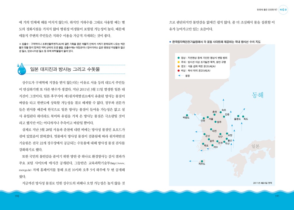 매일같이 마시는 물. 대한민국의 물은 안전할까? 지하수는? 약수는? 수돗물은? 솔직히 그 어느 것도 안심하고 먹기는 힘들다. 작년 말 전국을 강타한 구제역 파동으로 인해 지하수 오염 위험도는 급상승했으며 약수 또한 확실히 검증되지 않는 한 마시지 않는 것이 좋다. 어떤 세균이, 어떤 물질이 섞여 있는지 아무도 모르기 때문이다. 그나마 가장 안전하다고 하는 수돗물도 요즘엔 불안하다. 지난 2011년 3월 11일에 발생한 일본 대지진의 여파로 후쿠시마 제1원자력발전소에서 유출된 방사능 물질이 한반도를 위협하고 있다. 실제로 지난 3월 28일 서울과 춘천에 내린 비에는 방사성 물질인 요오드가 섞여 있었음이 밝혀졌다. 빗물에서 방사성 물질이 검출됨에 따라 원자력안전기술원은 전국 22개 정수장에서 공급되는 수돗물에 대해 방사성 물질 검사를 강화하고 있지만 불안을 떨치기엔 역부족.