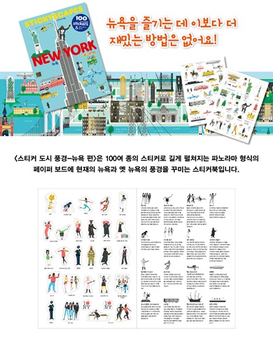 <스티커 도시 풍경-뉴욕 편>은 100여 종의 스티커로 길게 펼쳐지는 파노라마 형식의 페이퍼 보드에 현재의 뉴욕과 옛 뉴욕의 풍경을 꾸미는 스티커북입니다. 미국 뉴욕의 유명한 건축물은 무엇이고 어디에 있는지 또 유명 인사는 누구이고 어떤 사람인지 알 수 있습니다.