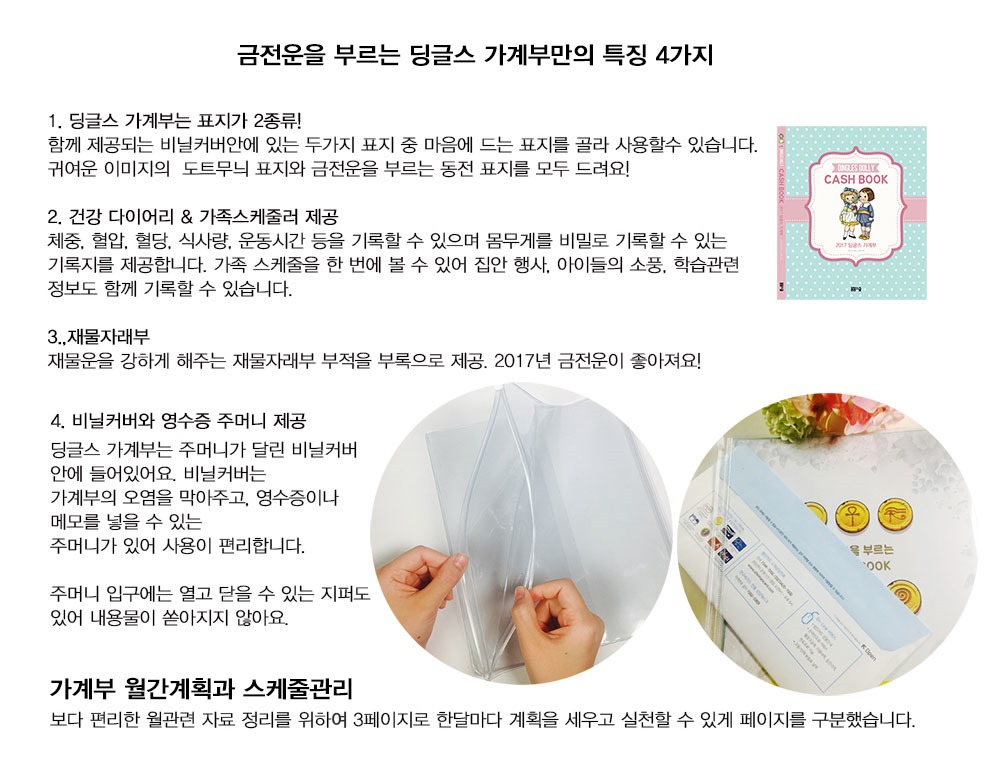 스마트함에 아이디어를 더하다요즘 많이 쓰는 스마트폰 가계부는 편리하긴 하지만 한 눈에 돈의 흐름을 파악하기 어렵다는 단점이 있어요. 이에 반해 [2017 딩글스 가계부]는 단번에 소비 패턴을 알 수 있는 것이 최대 장점으로 무엇보다 가계부는 손으로 차근차근 적어야 기억에 오래 남고 과소비에 대해 반성도 할 수 있어요. 지출 계획을 짜는 데는 종이 가계부가 스마트폰과 달리 생각할 시간과 전체 돈의 흐름을 생각할 수 있어 오히려 효율적이에요.