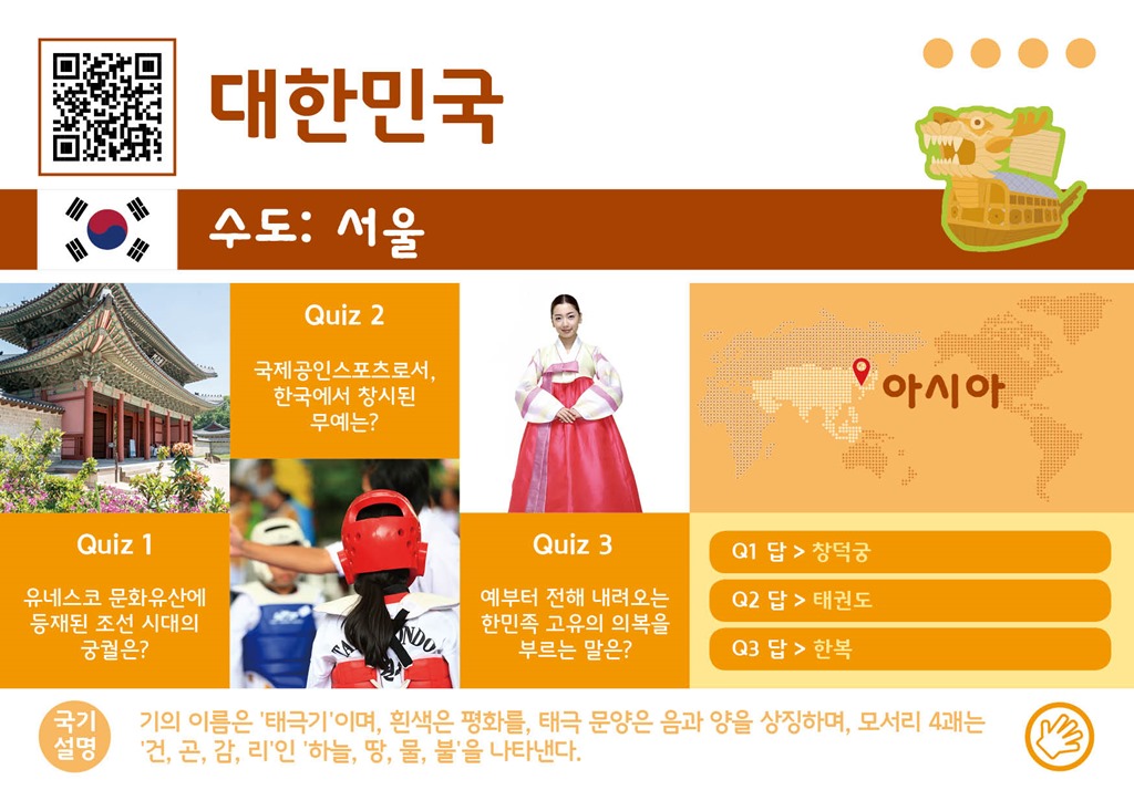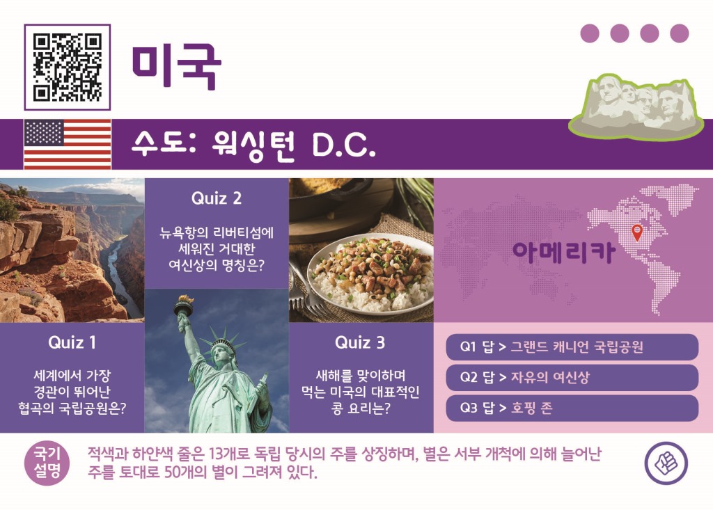 카드마다 QR코드가 있어, 나라명 · 수도명의 영문 표기와 나라별 인구 · 국토 면적 · 통화 단위 · 주요 언어 · 종교 등의 정보가 실린 웹페이지로 연결합니다. 이렇게 QR코드로 연결된 웹페이지에서는 국가 음원도 제공하므로 한 나라에 관련된 기본 상식을 골고루 알려주는 시청각 자료로서 손색이 없습니다.