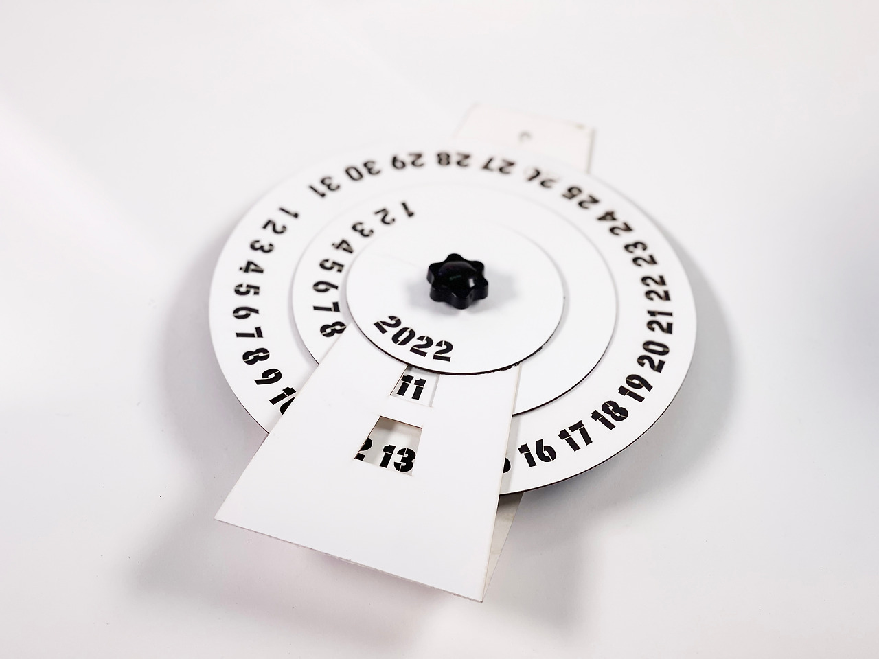 캘린더는 만 년형입니다. 휠을 돌리면서 월, 일 날짜를 회전해서 정해 놓을 수 있습니다. 현재 폰트는 별자리로 만들어놓은 상태인데 레이저 프린터의 토너가 없어서 레이저 커팅기에서 출력이 가능한 스탠실 문자로 디자인 테스트했습니다.