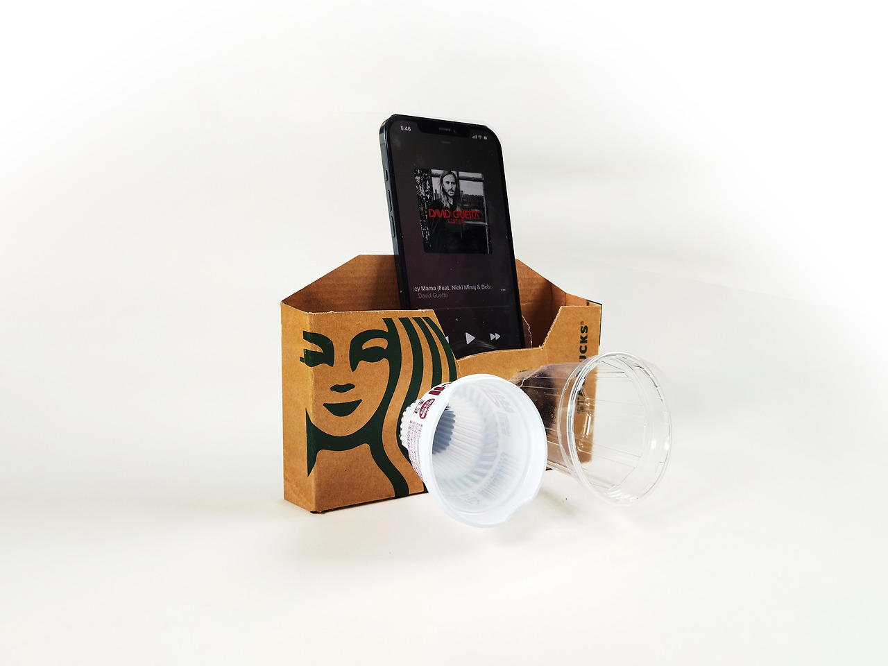 스타벅스 트레이와 빵빠레 아이스크림 케이스로 만들었고 레이저로 구멍을 뚫고 폰 사이즈에 맞춰 세울 수 있게 조정을 했습니다.아이폰은 왼쪽 스피커가 고음, 오른쪽에 저음을 담당합니다.