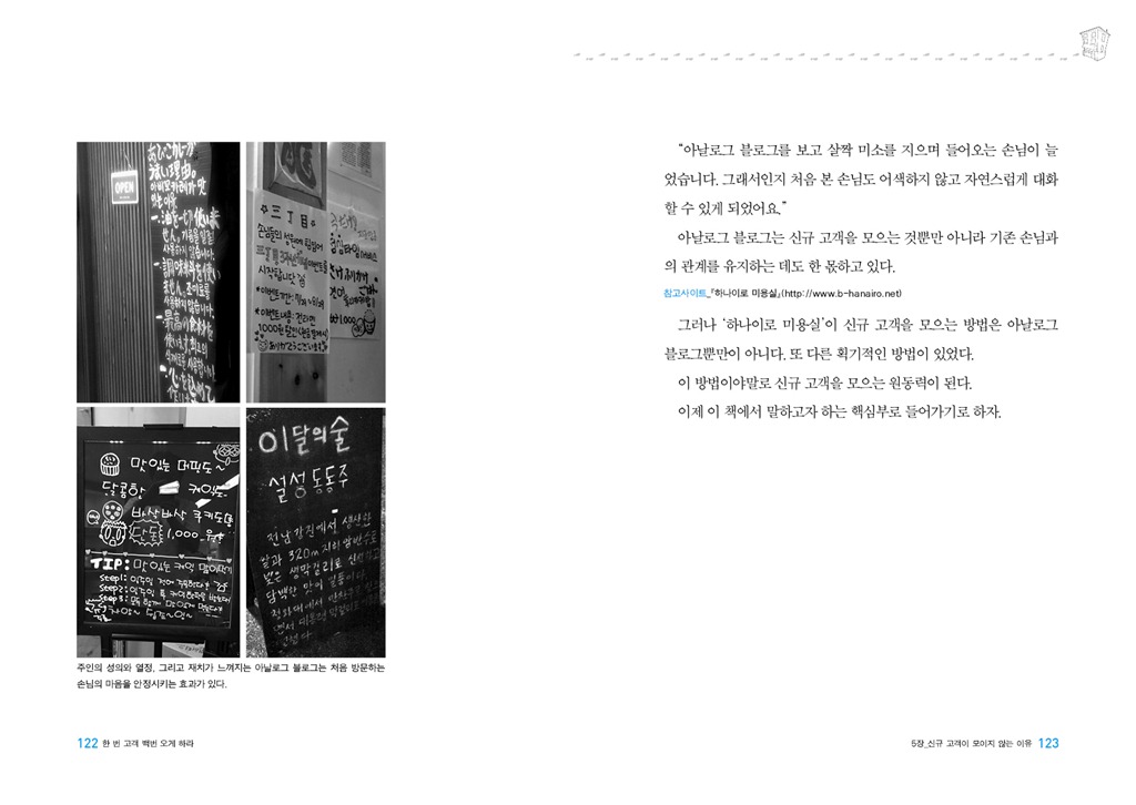 상품이 아닌 사람을 광고한다 / 고객은 모르는 사람에게 상품을 구입하는 것을 불안해 한다 / 잘 모르는 가게의 문은 열기 어렵다 / 손으로 쓰는 ‘아날로그 블로그’란 무엇인가? / 아날로그 블로그로 신규 고객을 모으는 ‘하나이로 미용실’