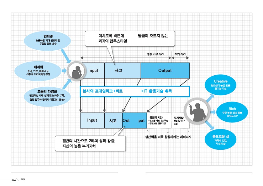 직장인이 생존 경쟁에서 살아남고 부유한 삶을 유지하려면 ‘지적 생산성을 최대한 끌어올리고, 창조적인 일’을 해야 한다. 그냥 시키는 ‘일’만 열심히 하는 비즈니스맨은 단명할 수밖에 없는 시대가 되었다. 때문에 지적 생산성이나 문제 해결방법을 피력한 지침서들이 쏟아지고 있고 화제가 되고 있다. 하지만, 지식을 입력(Input)만 한다고 자신의 가치가 올라가지는 않는다. 진짜 자신의 가치를 높이려면 결과물(Output)의 질과 양을 향상시켜야 한다. 장시간 앉아 있을 필요는 없다. 농도를 높이는 것이 중요하다. 저자 나가타 도요시는 현대 직장인에게 필요한 세 가지 역량으로 다음 세 가지를 꼽았다.(1) 프레임워크를 활용하여 최단 시간 내에 본질에 도달할 수 있는 역량