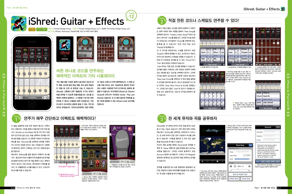 음악 앱이란 iPhone, iPod touch, iPad를 피아노, 기타, 드럼 등의 악기 혹은 시퀀서 등의 음악 제작 도구, 그 외에 리코더, 튜너, 악보 등으로 바꿀 수 있는 매우 흥미진진한 앱을 통틀어 이르는 말이다. 음악 앱은 애플스토어에서 ‘Music’ 카테고리에 분류되어 있으며, 2011년 1월 현재 iPhone용과 iPad용을 합쳐 9,000개 이상이 공개되었다.이 책은 그 가운데서 특별히 우수한 음악 앱을 엄선했다. 시퀀서, 신시사이저, DJ, 리코더 등 전문가들이 극찬한 고기능 음악 앱 20개의 사용법을 세세하고 친절하게 설명, 음악에 관심이 있는 사람이라면 누구라도 손쉽게 앱을 조작할 수 있게 안내한다. 또 함께 제공되는 부록 CD에 음악 앱으로 연주한 데모 트랙이 수록, 미리 해당 앱의 사운드 등을 체크해볼 수 있도록 배려했다. 이밖에도 주목할 만한 앱 카탈로그에선 기타, 피아노, 드럼, 악보, 튜너 등 모두 합쳐 250개 이상을 소개하고 있다.