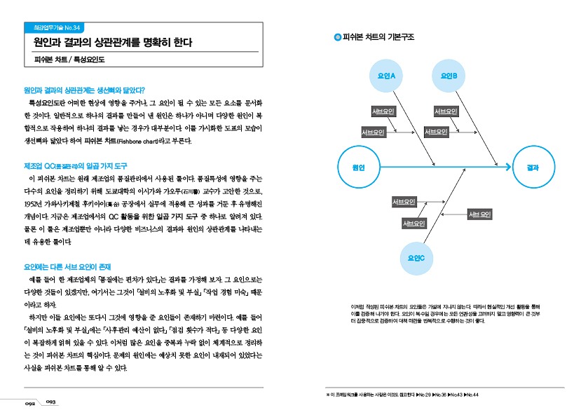 점점 좋아지는 선순환 고리를 만든다!(PDCA) / 중요도×긴급도로 우선 순위를 정한다(시간관리 매트릭스) / 스트레스에서 해방되기 위한 과제 리스트 정리법(GTD) / 선택지의 득과 실을 정리한다(Pros and Cons리스트) / 업무를 매뉴얼화하면 조직이 강해진다(성숙도 모델 6단계) / 원인과 결과의 상관관계를 명확히 한다(피쉬본 차트/특성 요인도) / 더 이상 지연은 없다! 크리티컬 패스 발견(PERT 도표/애로우 다이어그램) / 경쟁 우위가 있는 프로세스를 발견한다!(가치사슬) / 가치사슬을 재구축해 독자성을 확보한다(디컨스트럭션) / 고객도 종업원도 모두 윈윈!(서비스 수익체인) / 한 건의 클레임에는 다수의 불만고객이 존재(하인리히 법칙/1:29:300의 법칙) / 조직의 명령 체계와 업무 구분을 명확하게 한다(조직도) / 영향관계를 분석(인플루언스 다이어그램) / 생산량・누적경험량으로 비용을 절감한다(경험곡선) / 일본의 품질에 놀란 미국이 낳은 품질관리(6시그마) /업무프로세스를 가시화한다
