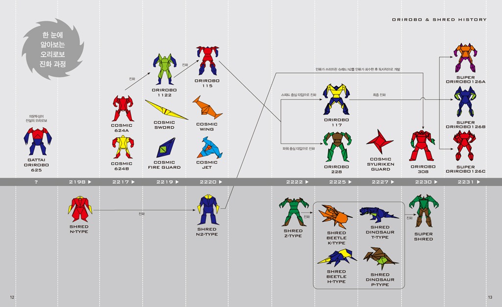 오리로보 115 /오리로보 1122 / 오리로보 624 / 오리로보 117 / 오리로보 228 / 슈퍼 오리로보 126 / 합체 오리로보 / 슈레드 N/ 슈레드 N2 / 오리로보 308 / 슈레드 Z / 슈퍼 슈레드 / 슈레드 비틀 K / 슈레드 비틀 H / 슈레드 다이너소어 T / 슈레드 다이너소어 P / 코스믹 제트기 / 코스믹 윙 / 코스믹 파이어 가드 / 코스믹 수리검 가드 / 코스믹 소드4. 저자 소개