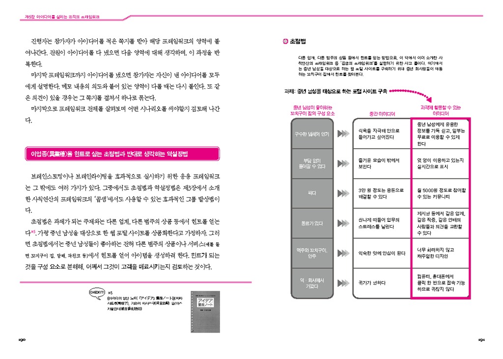 이처럼 창의적인 발상법은 현대 직장인들에게 반드시 필요한 덕목이지만 이상하게 그리 쉽지가 않다. 누구나 아이디어를 낼 수는 있지만 아무나 창의적인 아이디어를 만들지는 못하기 때문. 특히 우리나라 직장인들은 입시 위주의, 주입식 교육 탓에 뇌가 딱딱하게 굳어서인지 창의성과는 거리가 먼 편이다. 이는 가까운 나라 일본도 마찬가지.