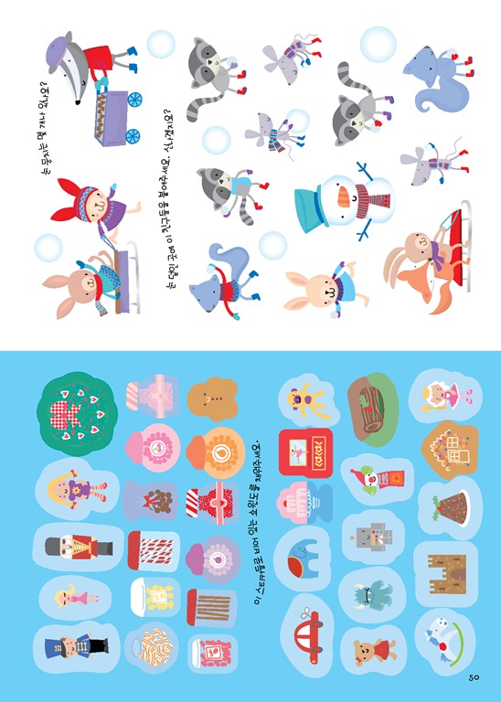 이뿐만이 아니다. 본문에 마련된 눈 덮인 언덕, 크리스마스트리, 겨울나무, 산타의 작업장, 크리스마스 벽난로, 눈 내린 마을, 캠프파이어 등의 배경을 이용, 자유롭게 스티커로 꾸미면서 개성과 창의력, 공간 감각을 기를 수 있다.붙였다 뗐다 자유로운 리무벌 스티커가 무려 1000개!