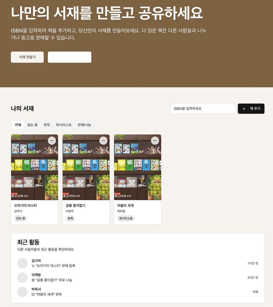 여기에 기능이 추가된다 정도 보시면 됩니다. 자기 서가를 공유하고 그 서가에 책을 대출해 보거나 다른 사람에게 판매하거나 뭐 그런 것도 해볼 수 있다 정도
