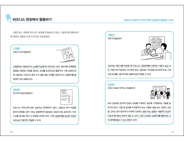 이 책은 업무와 학습에서 가장 기본이 되는 메모와 문서, 각종 기록을 즐겁고 유쾌하게 만들기 위한 기술을 소개하고 있다. 보고서와 기획안, 노트 필기, 회의의 기록들을 도해와 이모티콘, 픽토그램 등의 그림문자를 적절하게 섞어서 기록하면, 보다 쉽게 내용을 파악할 수 있고 효율적으로 머릿속에 저장된다. 또한 누락된 부분이나 모순점을 발견하는 것도 훨씬 쉬워진다.