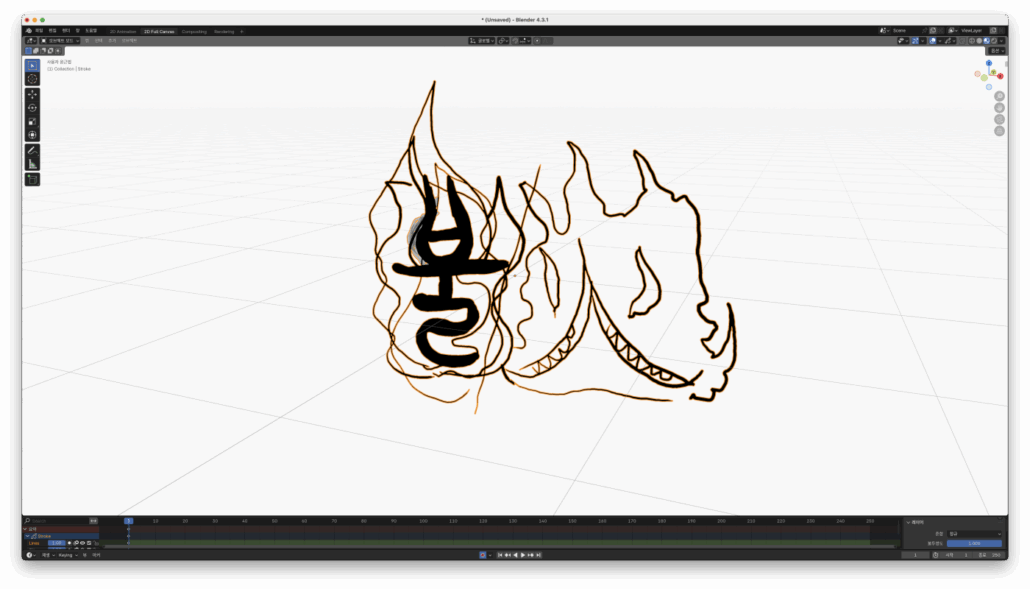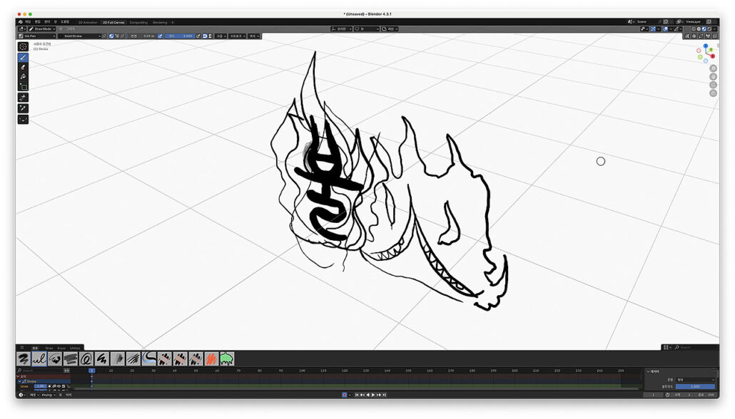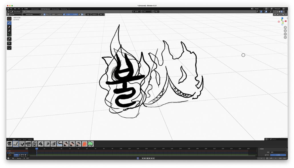 blender4.3.1 그레이스 펜슬을 이용해서 만화 효과음 폰트 만드는 방법을 연구를 하다가 애니메이션을 만들고 있었습니다.