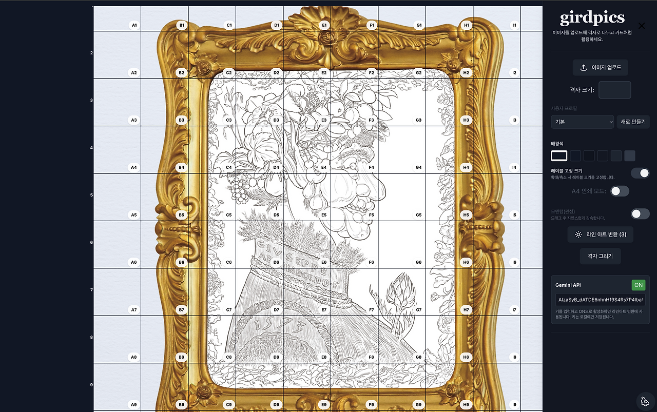 명화컬러링 , 명화 숨은 그림찾기… 사진을 넣으면 그림을 그리기 쉽게 Gridpic 을 폰으로 볼 수 있고 엑셀처럼 셀 단위로 경계선이나 그림을 연결해 볼 수 있는 것을 만들었습니다. 완성도 높여서 나노바나나에 대응을 해서 계속 고민하던 AI의 쓸모를 이제 찾은거 같습니다.