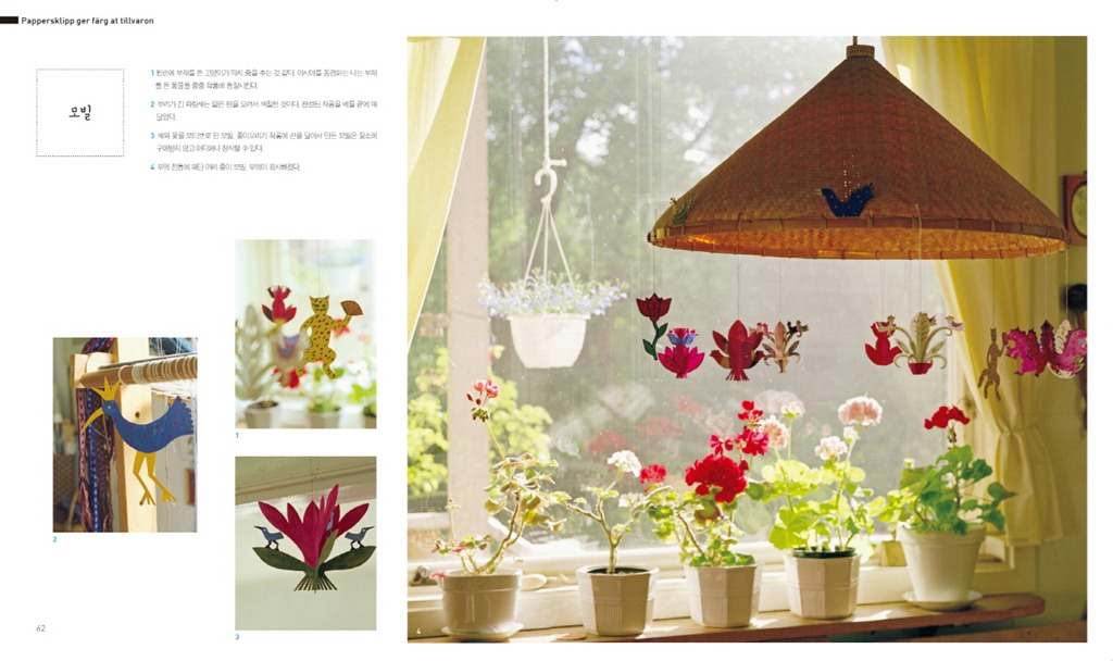 평면 종이 작품을 창가에 붙이면 색다른 인테리어 장식으로 전혀 손색이 없습니다. 입체 종이 작품은 테이블과 책장에 어울리며 모빌로 만들어 천장을 화려하게 만들 수도 있습니다.