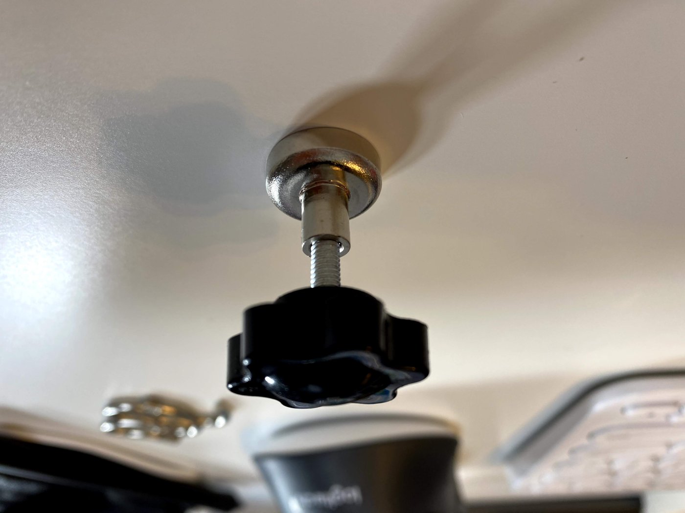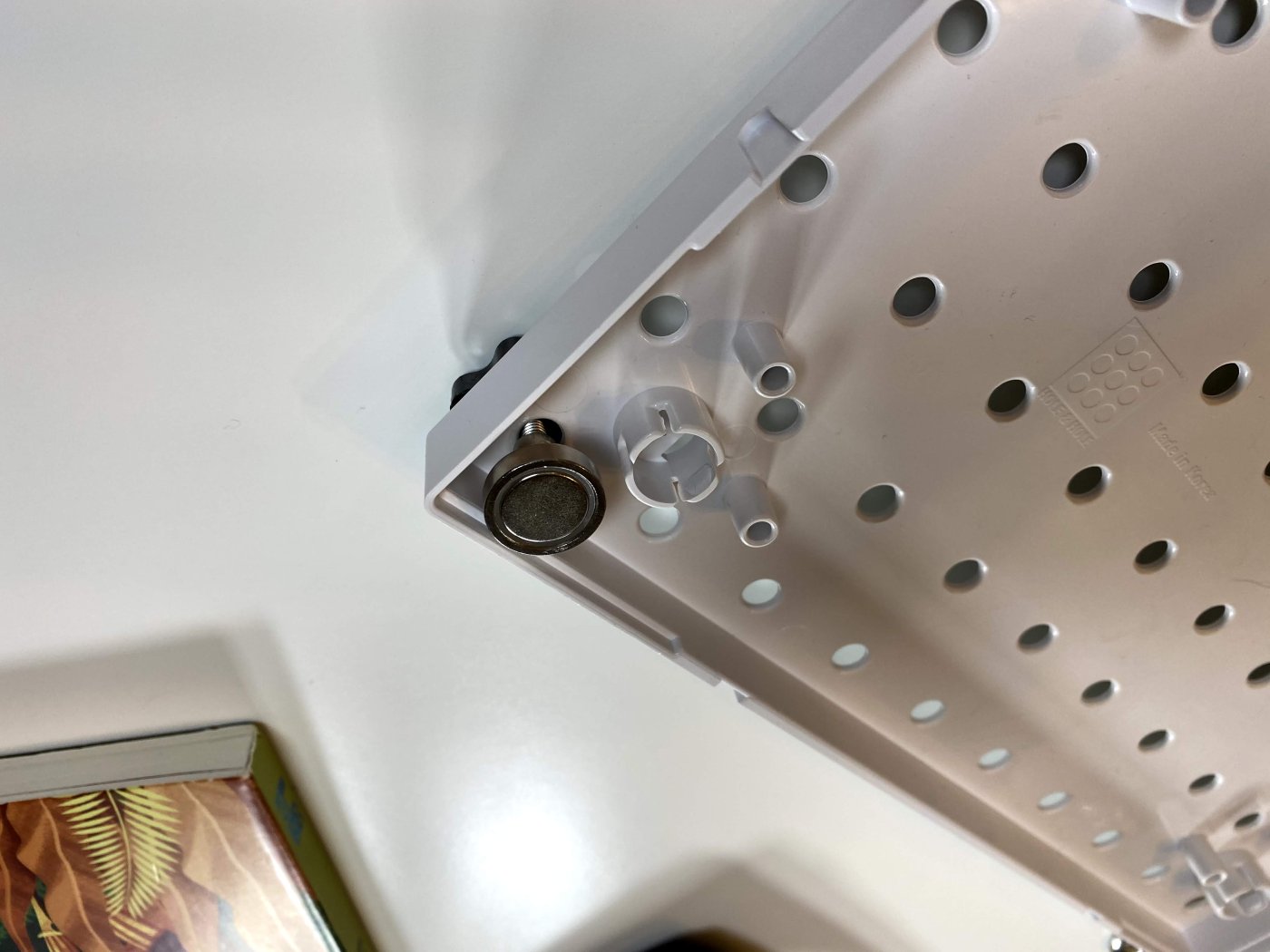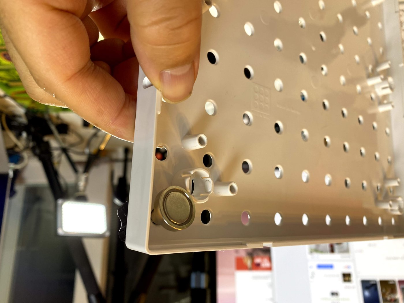 다이소에서 판매하는 2천원짜리 타공보드를 네오미듐 후크형 자석과 알리바바에서 나사를 구매해서 후크부분을 빼내서 결합했습니다.