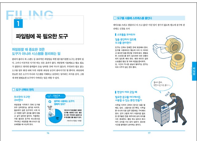 파일링 편에서는 하루에 수도 없이 쏟아지는 서류와 컴퓨터 파일 등을 정리하는 파일 정리술을 다룬다. 한눈에 어떤 서류가 어디에 있는지 필요할 때 바로 찾을 수 있는 서류 보관법이다. 책상 위가 항상 어수선하고 지저분한 사람은 일의 능률이 오르지 않는 것은 물론이고, 업무 능력까지 의심받는다. 파일링에 능숙해지면 업무 효율이 높아지고 쓸데없는 스트레스가 줄기 때문에 그 사람의 이미지까지 달라지게 하는 효과가 있다.
