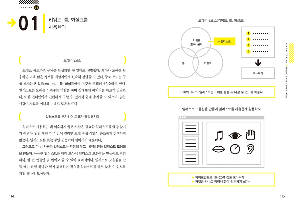 이 책에서 제안하는 생각정리 방법은 기본적으로 ‘생각→기록→확인’의 과정으로 이루어진다. 먼저 생각을 자유롭게 떠올려 내용을 종이에 직접 손으로 기록한 다음, 마지막으로 그에 대한 평가와 정리를 하는 것이다. 저자는 특히 손으로 쓰는 작업이 중요하다고 강조한다. 손은 제2의 뇌라는 말이 있듯이 손을 사용하면 그만큼 뇌 기능이 활발해진다는 것이다. 종이에 적어 나가는 것만으로도 주제에 대한 생각을 여러 가지 방향으로 진전시킬 수 있고, 보다 깊이 있는 판단을 할 수 있다. 이때 활용되는 기술이 바로 도해다. 여기서 도해란 생각을 그림으로 그려 정리하는 방법을 말하는데, 단어나 문장을 간단한 도형에 넣어 표현하는 것도 도해에 해당한다. 이 책에서는 브레인스토밍맵, 만다라트 등 도해를 통해 생각을 정리하는 다양한 방법을 소개한다.