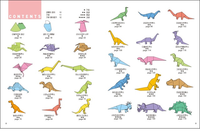 <공룡접기대백과>는 색색의 종이를 사용해 색채감각을 키우고 손과 눈의 협동작용을 통해 기하학적 원리를 이해할 수 있도록 구성했다. 특히 이 책은 난이도가 확실하게 구분되어 있어 본인의 접기 실력을 테스트할 수 있는 지침서 역할도 해준다.