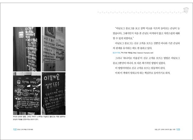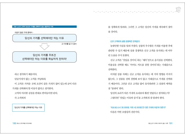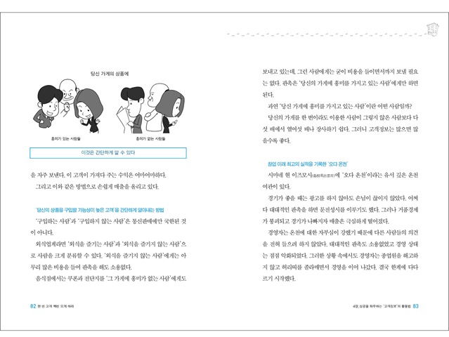 신규 고객을 고정 고객, 즉 ‘단골’로 만들어야 가게가 성공할 수 있다는 것은 당연한 얘기다. 모두 이 사실을 알고는 있지만 아무나 이렇게 만들지는 못한다. 오히려 신규 고객을 유치하는 것조차 힘들 정도다. 이를 위해 <한 번 고객 백번 오게 하라>에선 신규 고객을 모으는 방법과 그 고객을 고정 고객으로 만드는 방법에 중점을 두고 있다.