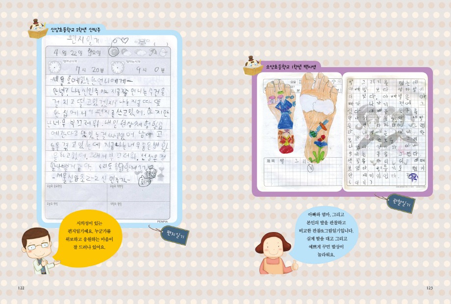 권말부록 [또래 친구들의 일기 엿보기]에는 초등학교 1~2학년 친구들이 실제로 쓴 일기장을 담았습니다. 친구들이 쓴 일기를 보면 앞에서 배운 내용을 토대로 좀 더 쉽게 일기를 쓸 수 있을 것입니다.