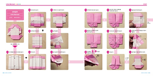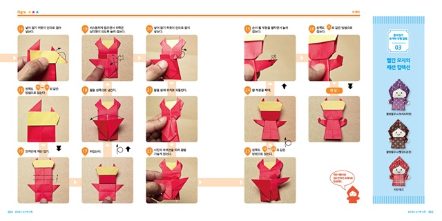 <빨간 모자>, <인어공주>, <개구리 임금님>, <미운 오리 새끼> 등 친근한 동화 속 주인공과 친구들, 그리고 여러 동물들을 접어 동화를 재연할 수도 있고 직접 만든 이야기로 인형극을 꾸밀 수도 있습니다. 또 핼러윈과 크리스마스 등 특별한 날에 필요한 호박과 박쥐, 산타와 순록 등의 이색 접기도 마련되어 있습니다.
