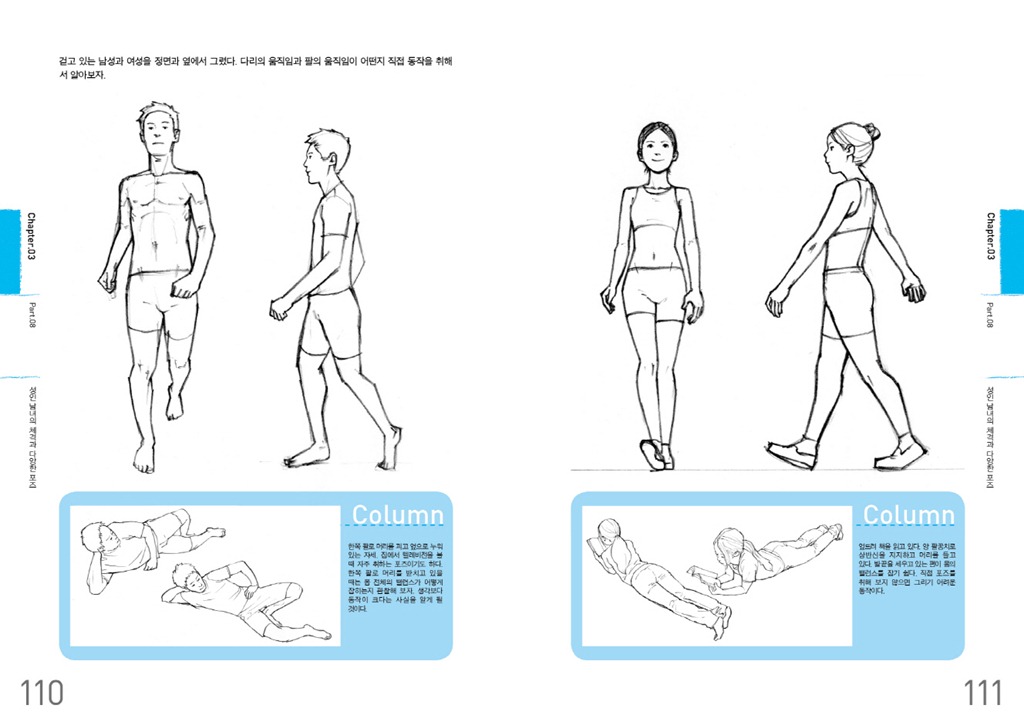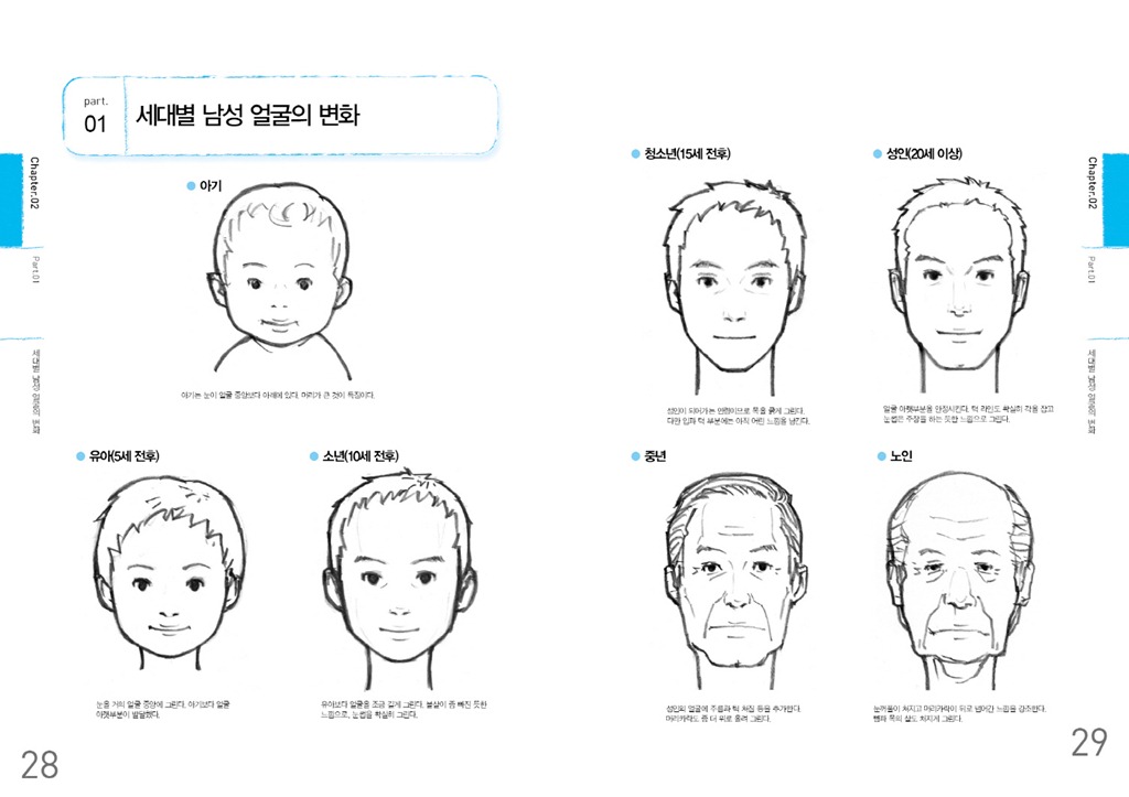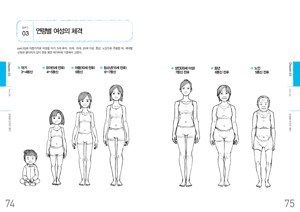 인물은 유아, 청소년, 청년, 중년, 노인 등의 연령대에 따라 특징이 다르기 때문에 구분해서 그리지 않으면 어색해지기 마련이다. 예를 들어 유아 캐릭터를 그릴 때는 일반적으로 4등신 정도로 그리는데, 머리가 너무 크거나 작아지면 균형이 맞지 않아 이상하게 보인다. 노인 캐릭터의 경우 발목이 약해지고 몸의 무게중심이 앞으로 쏠리기 때문에 재빠른 동작을 취하게 되면 부자연스럽게 보인다. 이 책에서는 각 연령대별로 체격이나 주요 포즈 등을 자세히 설명하고 있다. 뼈나 근육의 움직이나 의상과의 위치 관계를 디테일하게 표현하고 있는 예시 일러스트를 참고하면 더욱 생동감 넘치는 캐릭터를 그릴 수 있다.