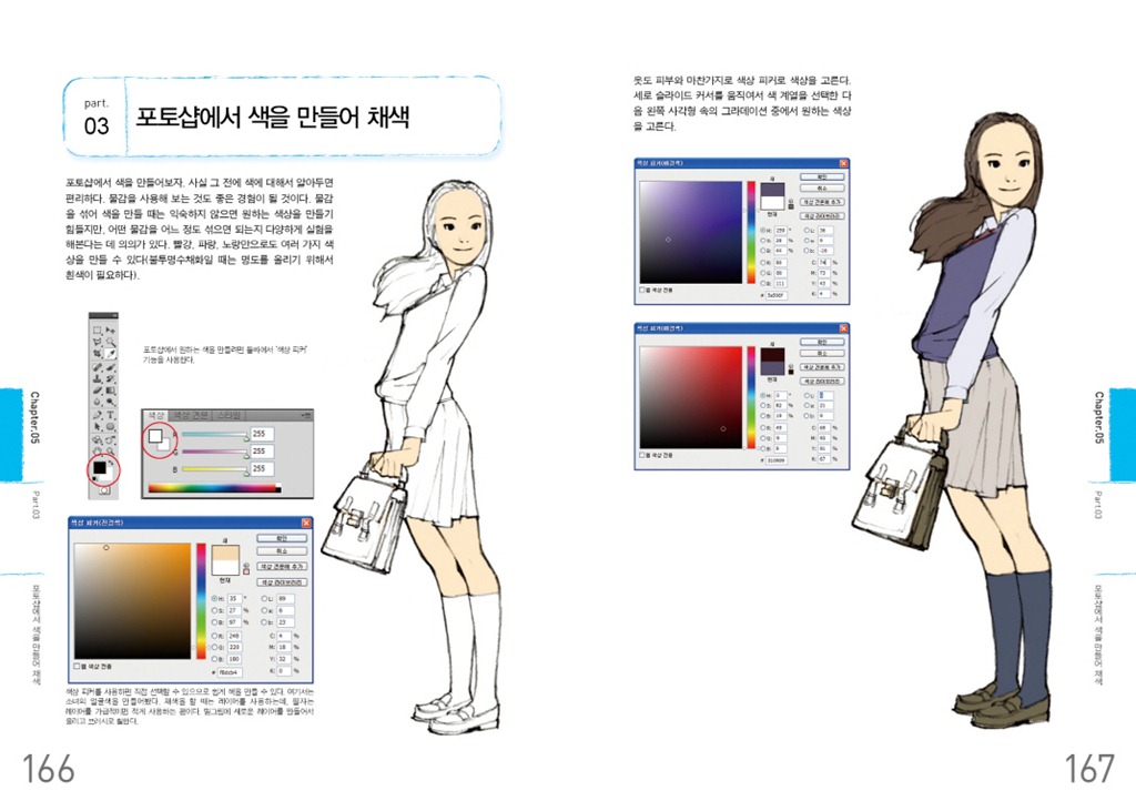 마지막 챕터에서는 포토샵을 이용한 채색 테크닉도 배워볼 수 있다. 색상 피커를 이용해 캐릭터에 색을 칠하고, 이미지 겹침 기능을 이용해 배경을 그리는 등 일러스트를 완성하기 위한 다양한 노하우가 실려 있다.