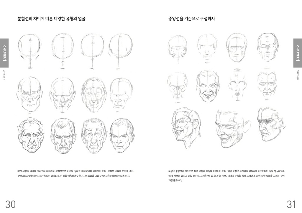 이런 요소를 조합하면 수만 가지 유형의 두상을 그리는 것이 가능해진다.