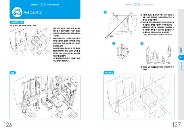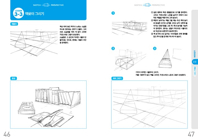 <배경과 소품 그리기>는 총 7개 장으로 구성되어 있다. 1, 2장에서는 본격적인 스케치에 앞서 평면도형, 입체도형 그리기, 투시도법과 같은 기본적인 기법을 다룬다. 중요한 포인트만 짚어주고 있기 때문에 부담없이 읽어나가면 된다. 뒤에 이어질 내용을 이해하기 위한 워밍업 과정이라고 생각하면 좋을 것이다. 3장부터 7장까지는 1, 2장에서 배운 내용을 토대로 소품과 공간을 그리는 방법을 구체적으로 소개한다. 연필과 샤프, 스테이플러, 가위와 같은 일상적인 소품과 거실, 침실, 사무실과 같이 그림에 자주 등장하는 공간을 어떻게 그려야 할지 알아본다. 만화가나 일러스트 작가를 꿈꾸는 사람이라면 수없이 그려보게 되는 대상을 수록하였기 때문에 활용도가 높다. 자신의 실력이 부족하다고 해서 겁먹을 필요는 없다. 이 책에 실린 방법들은 재능이나 실력과는 관계가 없기 때문이다. 저자가 제시하는 몇 가지 단계에 맞추어 꾸준히 연습을 하다 보면 입체감이 살아나는 그림을 완성할 수 있다. 각 장의 마지막에는 앞서 다루었던 기법을 정리하는 내용과 함께 저자의 조언이나 경험담이 실려 있다. 평소 그림을 그리면서 궁금했던 점에 대해서 답을 얻을 수 있고 몰랐던 부분에 대해 새로운 정보를 얻을 수 있다.